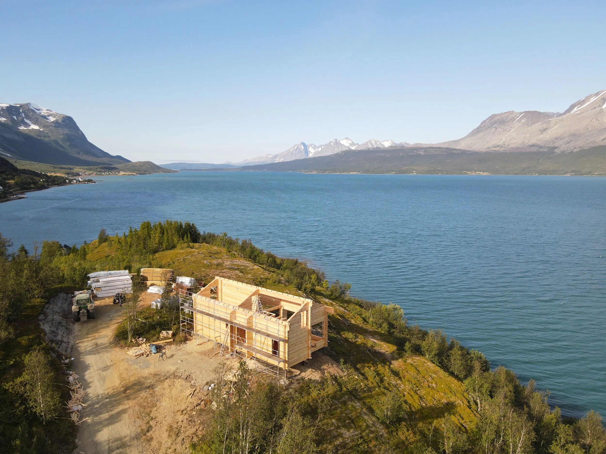 A house under construction on a hillside overlooking a large body of water with mountains in the background.